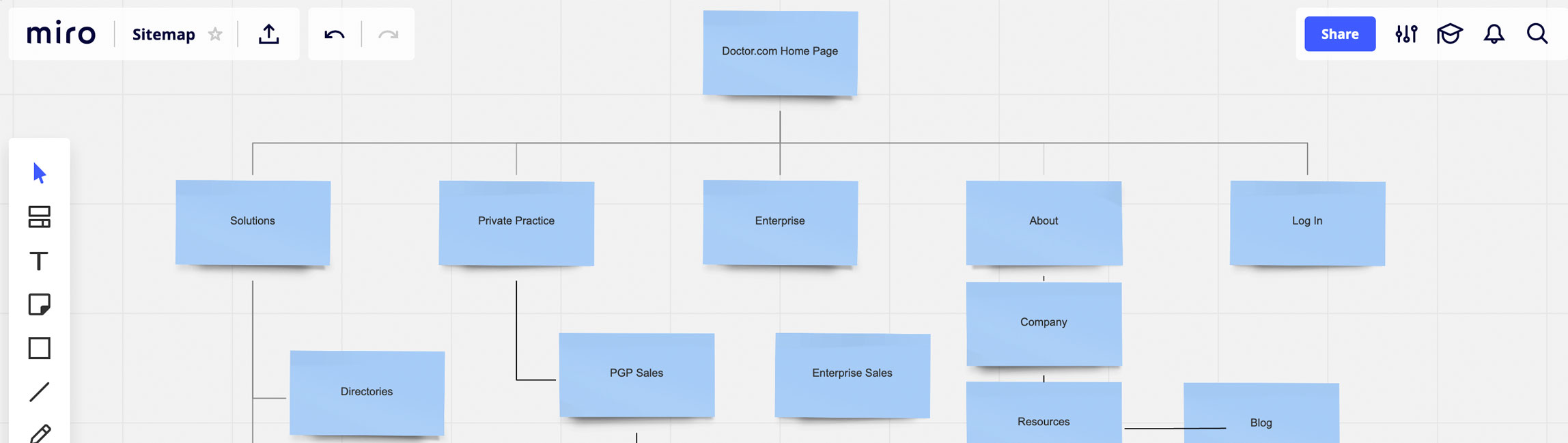 After nailing down the brand identity and handing off to the team to implement, it was time to get started on the new website. We started by card sorting and creating site maps in miro. We based what to include based on a features matrix, relevance of content, and how much traffic the pages had previously gotten.