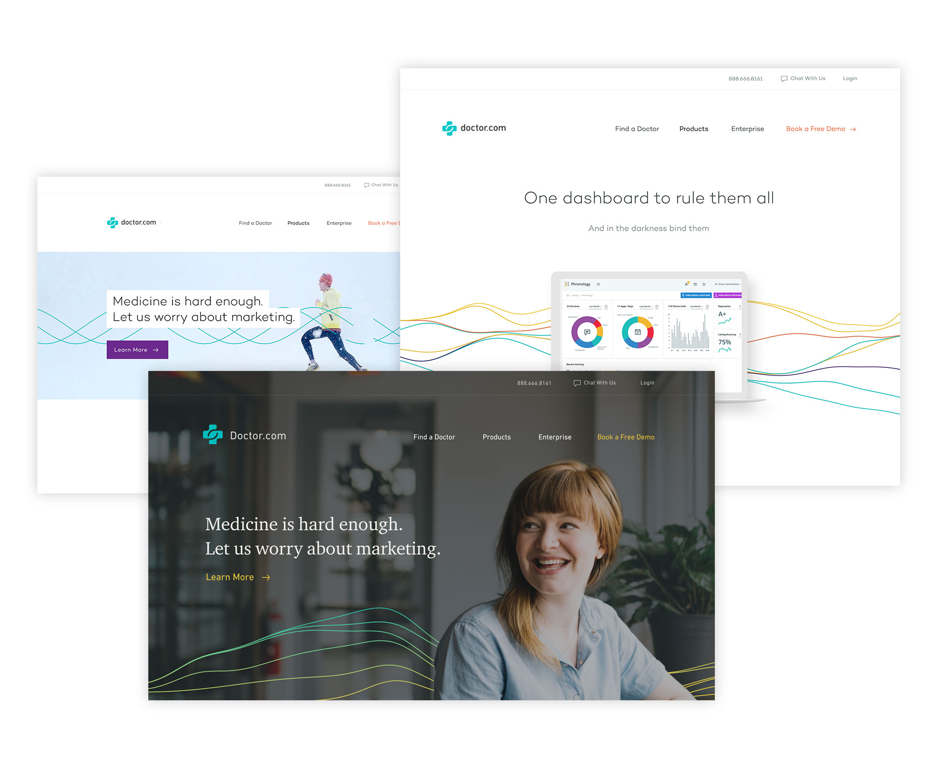 Doctor.com is based in NY, Connect Healthcare in Atlanta. The former focused on individual doctors and private practice, while the latter dealt with enterprise and large-scale health systems. Offices are located in NY, Cupertino, Argentina, India, Arizona, Seattle, and Atlanta. We needed a new logo, website, contracts, business cards, conference materials, and more. With our merger getting announced at a healthcare conference four months away, we had our work cut out for us.